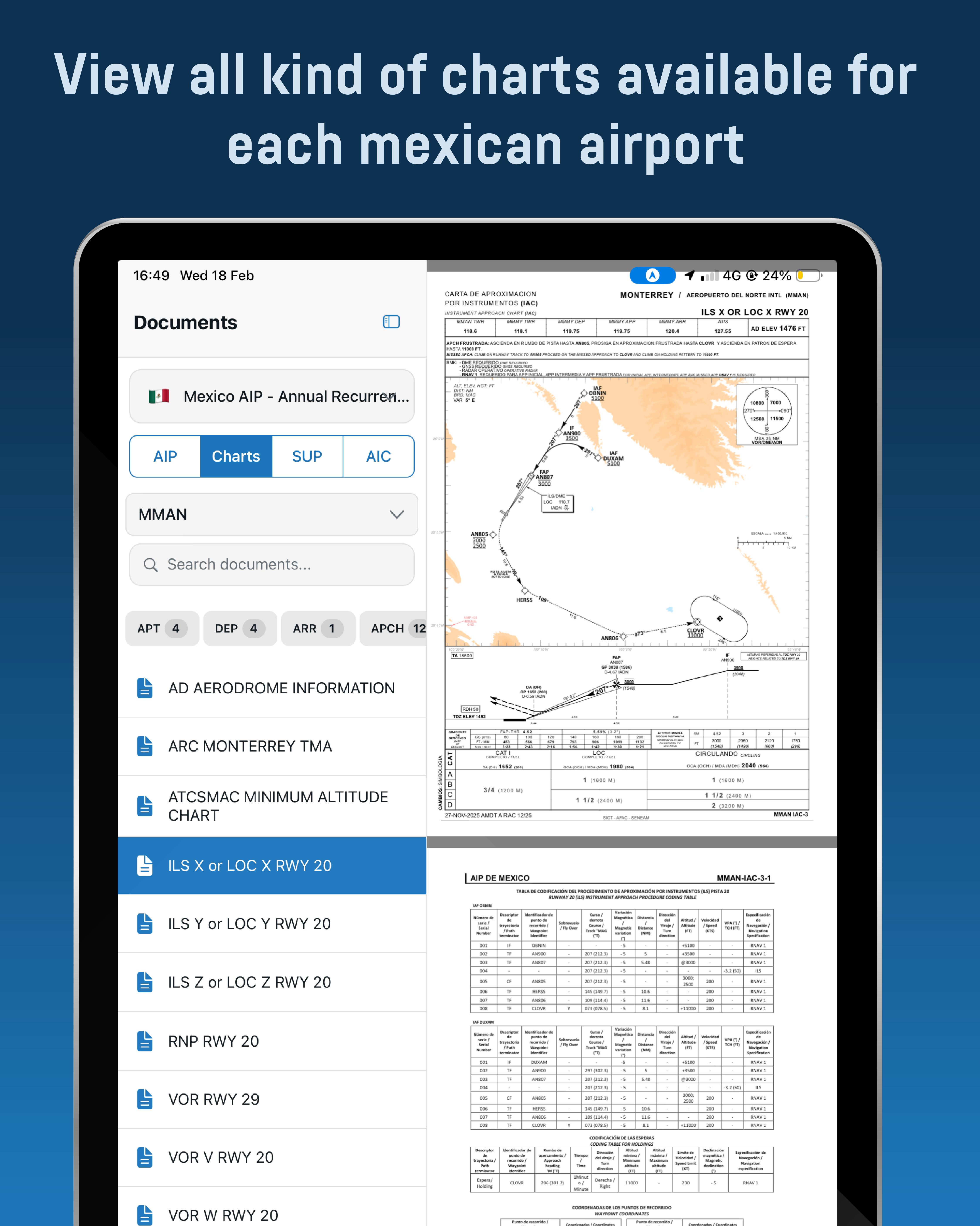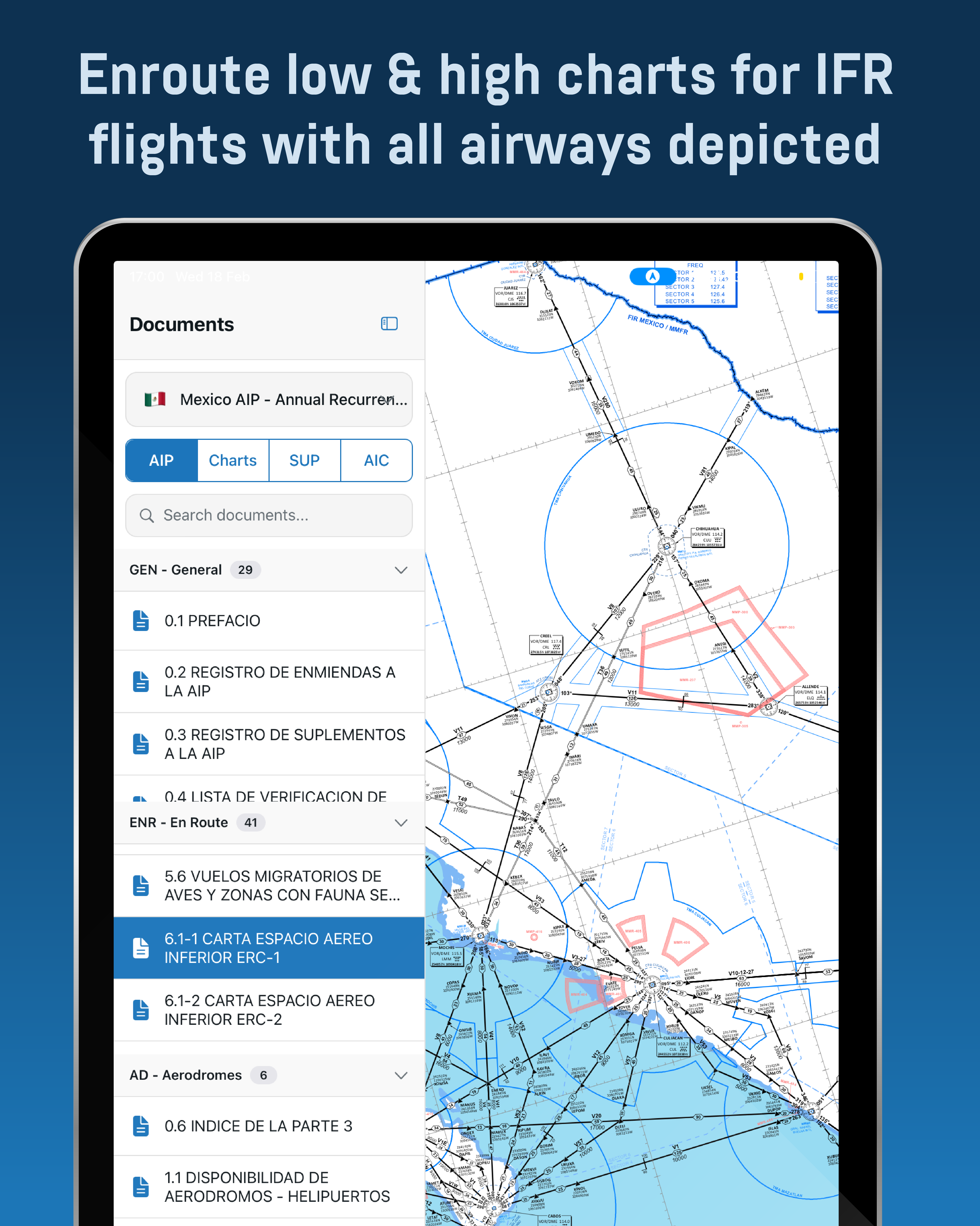 Mexico AIP Charts package contains the complete AIP published by SENEAM, covering all controlled airports and applicable uncontrolled aerodromes in Mexico. This package is designed for use with Jetstream Charts app available for iPad (any model), the ForeFlight EFB app available for Apple devices (iPad or iPhone) or as a store add-on product in Air Navigation Pro app available for Apple and Android devices (tablet or phone); a valid ForeFlight or Air Navigation Pro subscription is required. Please visit ForeFlight website to purchase a subscription or add to your cart an Air Navigation Pro subscription within our website for your convenience.