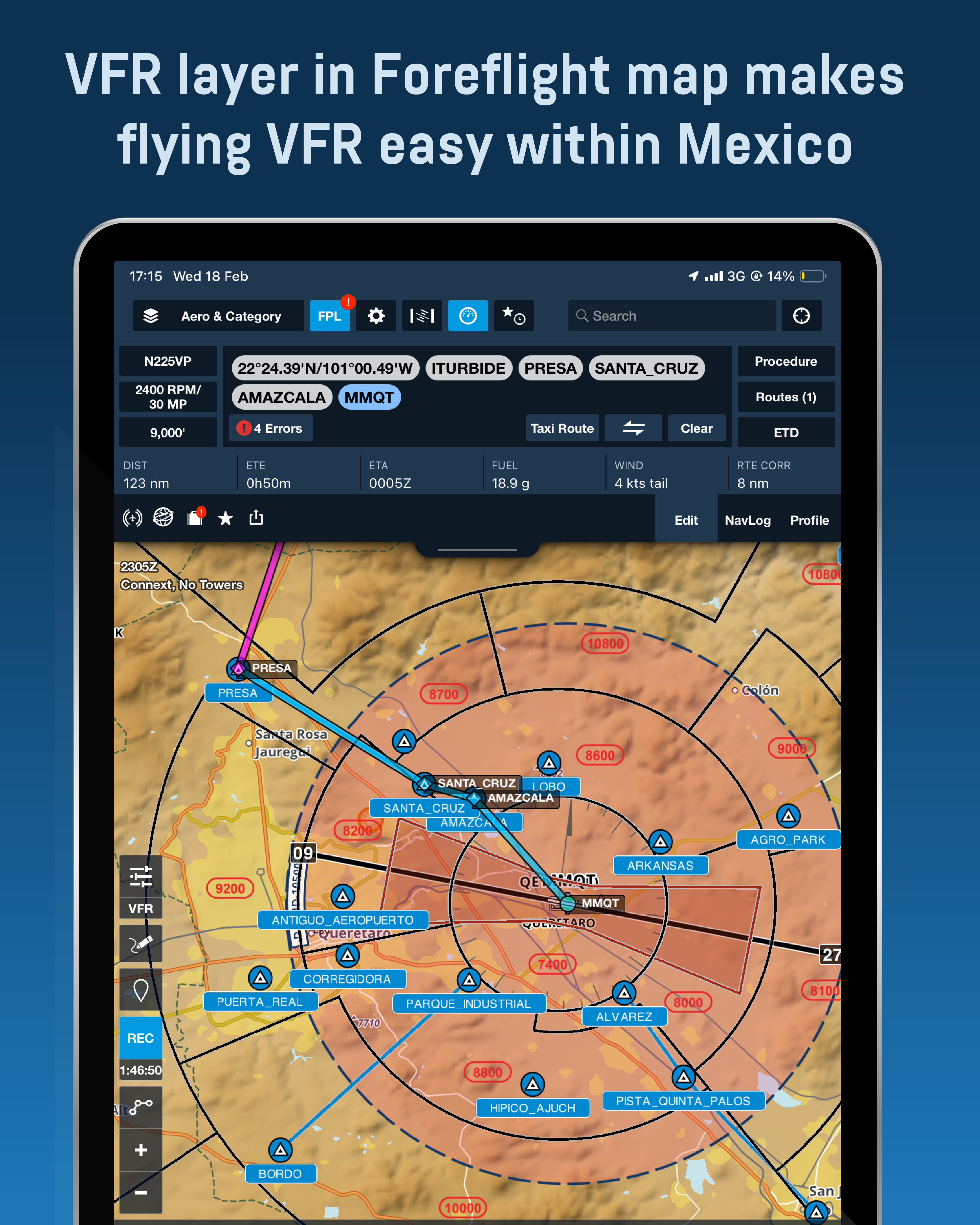 - Mexico VFR Fixes: This layer includes all the VFR fixes including labels. If you activate this layer, you will be able to select and navigate to a VFR fix and add it easily to your route as well. You can toggle this layer at the bottom of the right column within the layer selection pane in the map section.